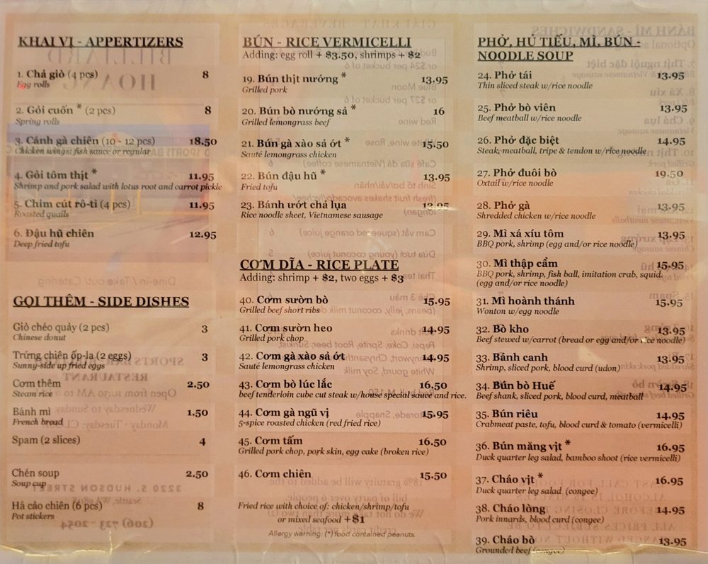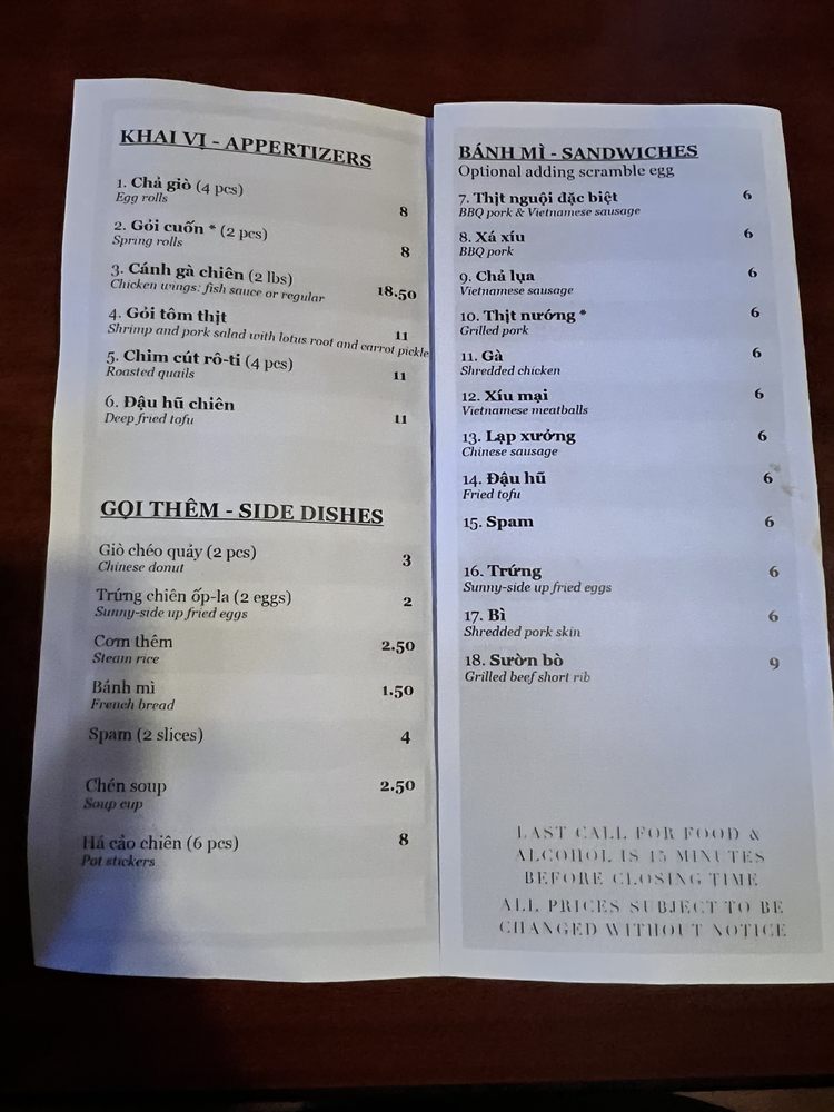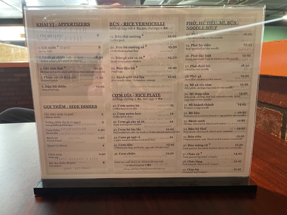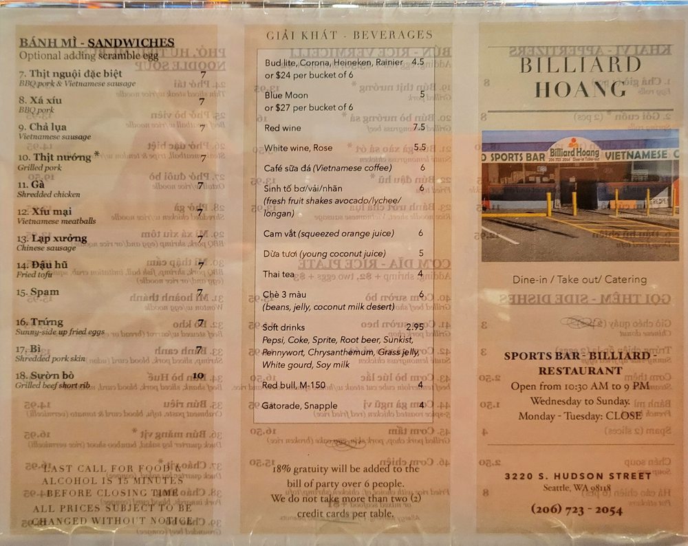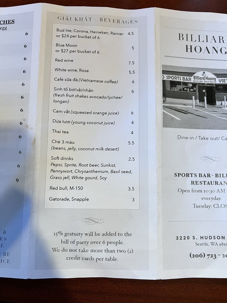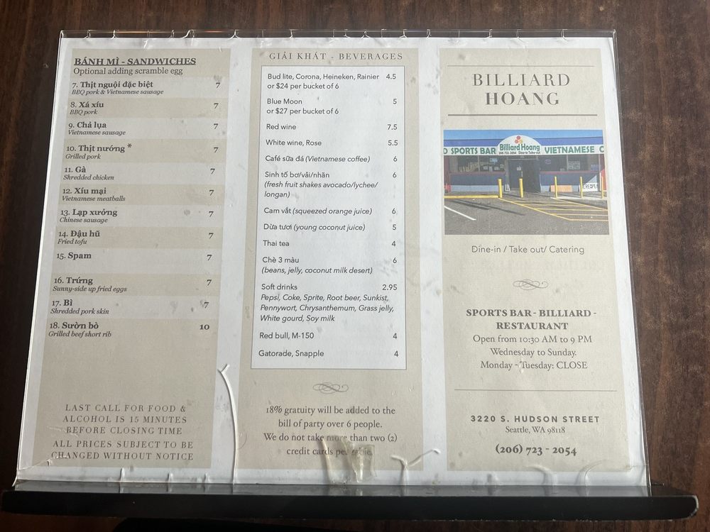 Introducing the menu at Billiard Hoang, a Vietnamese pool hall in Seattle, offers a unique blend of traditional Vietnamese dishes and a fun, casual atmosphere. The menu includes classics like pho, banh mi, and spring rolls, all prepared with fresh ingredients and flavorful seasonings. Customers rave about the Tofu Banh Mi, Egg Rolls, and the Grilled Pork Banh Mi, highlighting the generous portions and delicious flavors. The Oxtail Pho stands out as a must-try dish for its tender meat and rich, savory broth. With a variety of options for vegetarians and meat-lovers alike, Billiard Hoang caters to a diverse range of tastes. The combination of tasty Vietnamese cuisine and the entertainment of billiards make this spot a must-visit for a fun and satisfying dining experience.